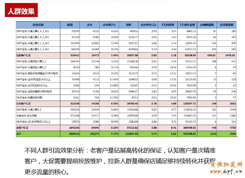 鉆展的部署還涉及到展位。簡單來說分為三個部分:站外、站內和明星店鋪。賣家在投放鉆展的時候每個展位的使用意義都不一樣,站外展位主要是做拓新、宣傳和召喚老客的工作,它的點擊單價也相對較低,可以讓客戶對店鋪產生相關的認知。在人群上,也可以劃分為三種。首先是拉新人群,這是指對店鋪完全沒有認知的用戶,這部分人群是店鋪未來持續發展的基礎。在人群方面,鉆展除了防守,拉新也是非常重要。簡單舉例,比如女裝,更多的話是在年齡和風格上劃分人群,在達摩盤里都有相關的標簽。但是簡單的用屬性去拉新,效果不是很理想。所以賣家要根據相關人群的購物軌跡去拉新,這樣才會更加精準。二,防守人群。防守人群更多的集中在店鋪的老客戶和認知客戶。這些人群對店鋪來說已經有成交,也有一定認知,這部分人群需要一個契機去進行投放。三,攻擊人群。這也可以通過御膳房中數據去部署。