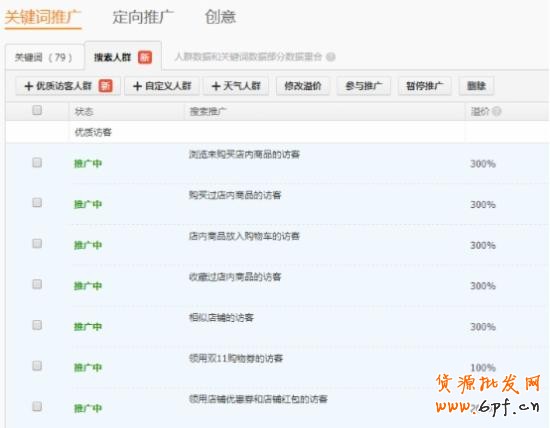 2、通用詞出低價然后搜索人群高溢價。因為通用詞面對的人群很廣,例如“面膜”這個關鍵詞,搜索這個關鍵詞的有想買補水保濕面膜的,有想買美白面膜的,還有想買祛痘面膜的,這些人都會搜索“面膜”。無論你的面膜功能多全,知名度多高,必定大部分人都不會買你的面膜。如果你直接出高價搶占第1名,結果自然是虧死。此時的策略是低出價,低到第一名出價的1/4左右,然后通過“搜索人群”功能給優質訪客增加300%的溢價。這樣做的目的是讓搜索這個關鍵詞的人大部分看不到你,但是你店鋪的優質訪客可以在第1名的位置看到你的推廣。如下圖所示: