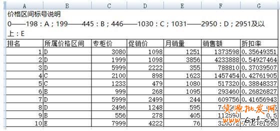 為了方便統計,我們對價格區間(來自于淘寶搜索)進行了標號列示。然后銷售額的計算是銷量*促銷價,折扣率的計算是促銷價/專柜價