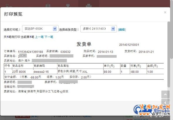可以點擊訂單后邊的“打印發(fā)貨單”按鈕 ,進行單筆訂單的打印和預(yù)覽: