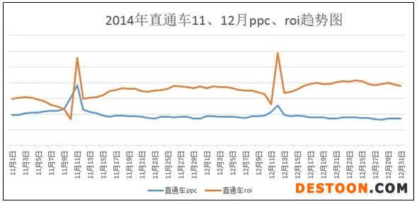 圖一:2014年直通車11月、12月ppc、roi趨勢圖