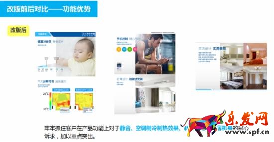 在功能方面,海爾一改過去展示沒有重點,內容安排不合理的問題,牢牢抓住客戶在產品功能上對靜音、空調制冷制熱效果、耗電省電的核心訴求,內容明了,重點非常突出。