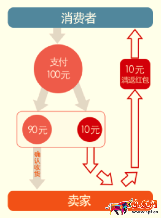 例如:A訂單100元,返給消費者10元現金紅包,賣家在返給消費者10元后剩余90元。