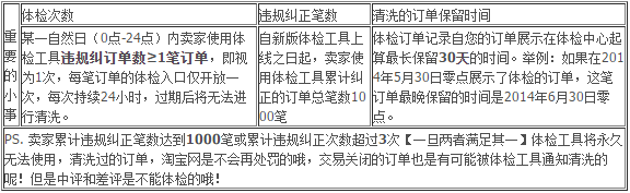 比如說親親您在2015年4月16日,使用了1次訂單體檢工具,那親從5月26號開始又擁有了3次訂單體檢或1000筆違規糾正筆數的機會哦!