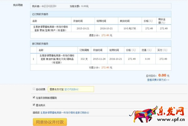 step3.點擊確定后,系統進入服務市場進行類目變更的訂單變更操作。詳見下圖(注意類目變更無需另外增加費用,此處生成的是一個0元的訂單)。在同意支付協議,顯示“訂購成功”后,類目變更即成功。