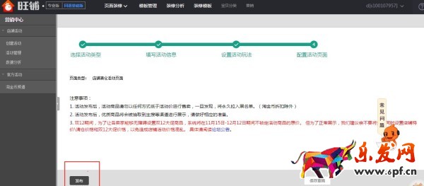 第七步:發(fā)布創(chuàng)建的活動,活動將在指定時間內(nèi)生效,設(shè)置的商品將由系統(tǒng)打上“淘清倉”標簽的折扣價格,活動一旦設(shè)置生效,淘清倉價格標簽將生效至活動結(jié)束期,旺鋪后臺取消活動的創(chuàng)建,淘清倉價格標不會失效,請知曉。