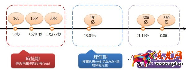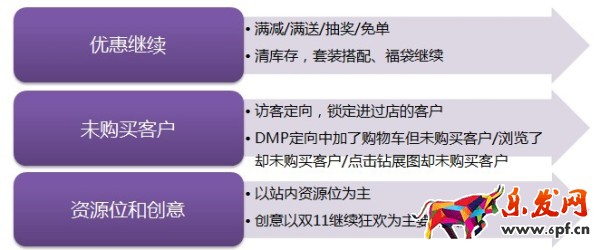目的:雙11高潮期,通過前期用戶的蓄積,當天最主要就是刺激購買轉化,提升客單價,保持全天全時段流量持續高漲。定向溢價出到心里能承受價格,根據數據反饋及時調整。尤其是訪客定向、興趣點定向、DMP定向里的重點預熱期鉆展觸達過的客戶,包括鉆展展現過、點擊過的客戶,還有加收藏和購物車客戶,同事大流量資源位上要用通投來鋪面。如果未參加雙11會場,可提前引爆活動,用較低的成本獲取流量。