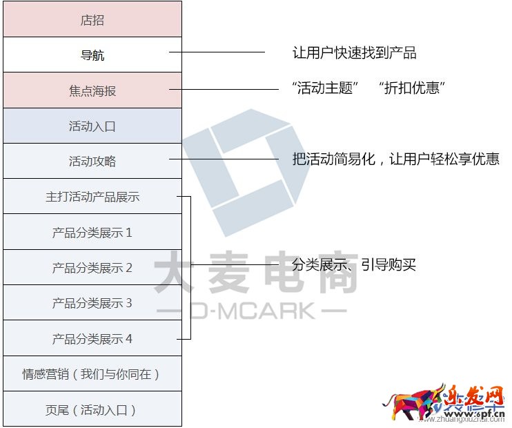 在雙11期間,我們落地頁的主要作用是介紹雙11優(yōu)惠活動,將盡快的將流量分流到合適的位置,促使用戶成交。那么我們落地頁的布局應(yīng)該有的模塊有:店招,焦點海報,活動攻略,主打產(chǎn)品,產(chǎn)品地圖,產(chǎn)品分類展示等。按照重要性,從上到下排列,如下圖: