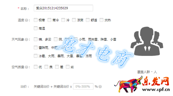 天氣標簽分為:溫度、天氣氣象、空氣質量,不同的類目可能使用的情況也會不同,像雨具的賣家,天氣標簽的設置的作用是很好的,還有服裝類目在做預熱的時候,也是可以用到這個天氣標簽,防霧口罩類目的就可以根據空氣質量去做選擇。一般類目的空氣質量可以不做選擇,因為第一這個標簽的影響不是很大,第二避免縮小圈定的人群。