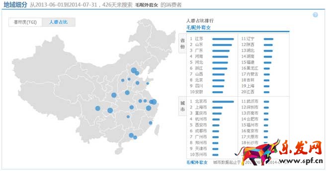 我們繼續(xù),從下圖可以知道喜歡搜毛呢外套女這個(gè)關(guān)鍵詞都分布在哪些地方還有人群占比各是多少,這個(gè)數(shù)據(jù)適合大家拿去做直通車地域投放,喜好度低的地區(qū)就可以不投放,從而提高直通車點(diǎn)擊率。