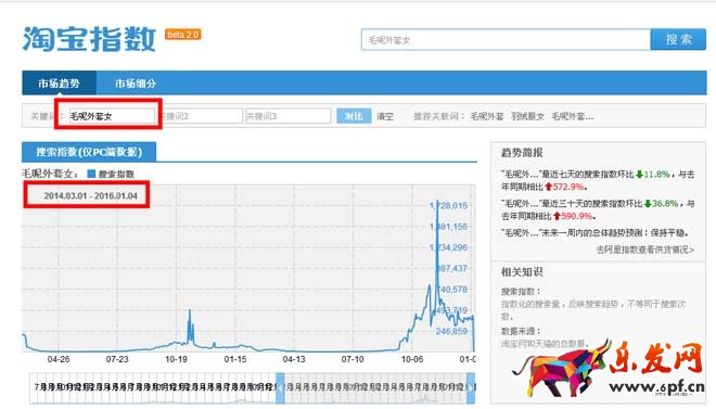 首先打開淘寶指數(shù),搜索毛呢外套女,這里截取的時(shí)間比較長。從這個(gè)走勢(shì)圖我們可以看出毛呢外套女可以賣多久,這個(gè)時(shí)間還是比較長的。