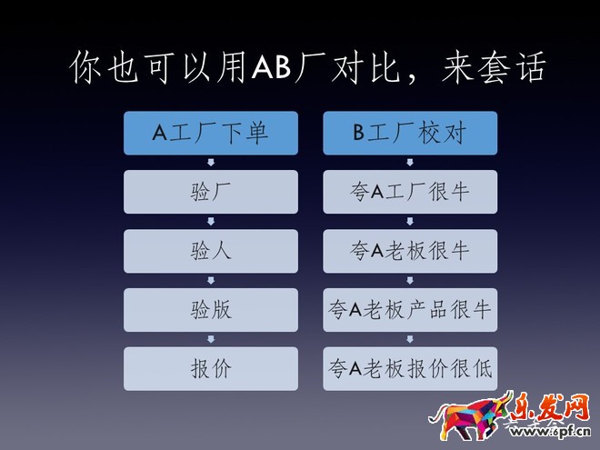 驗版環(huán)節(jié):去B工廠老板面前夸,夸A產品很牛,往大說,B老板就會告訴你A產品哪里有問題!