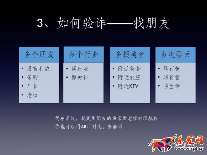 驗人環(huán)節(jié):去B工廠老板面前夸,夸A老板很牛,往大說,B老板就會告訴你A老板哪里有問題!