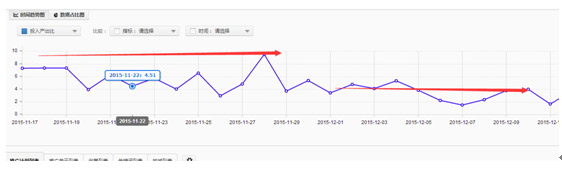上面的兩張圖分別是投產趨勢和轉化率趨勢,從中可以看到11月份和12月份明顯的變化。根據以往的經驗得出,如果直通車的轉化率一直按照這個趨勢發展的話,投產會越來越差,質量分也會隨著下滑,導致花費增加。這時候該怎么辦呢?