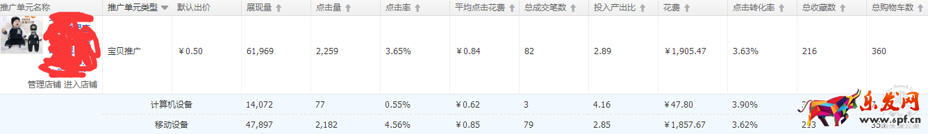 這里舉例講兩個數據維度:收藏率和加購率。直通車后臺的數據統計是沒有幫你計算得出的,需要根據數據自行計算。通過以上數據可以計算得出移動端的寶貝收藏率為9.76%,加購率為16.18%。對比PC端而言是要高出許多的。再結合所添加關鍵詞的情況,找出收藏率和加購率相對寶貝收藏率加購率更高的關鍵詞,在平均展現排名有提升空間的前提下,重點進行卡位操作,提升移動端競爭力,逐步拉升權重。當然,如果想比較省事,也可以直接拉升移動端的投放力度,這樣的做法也可以提升移動端點擊率,但是可能會花費比較大,建議根據實際情況操作。