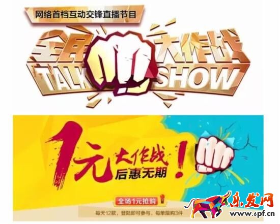 顏色方面我們模仿一些網(wǎng)上的圖片做參考,我們可以找到很多“1元秒殺”、“1元包郵”等字樣的banner,大多數(shù)都是黃底紅字或者紅底黃字。我的文案“1元大作戰(zhàn)”是本文案中的重點,基本和他們類似。因此我選擇參考他們的。