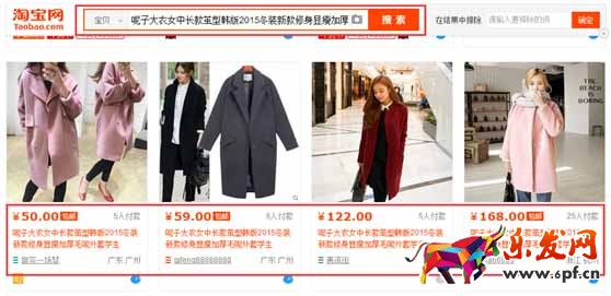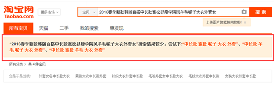 看紅框的部分,搜索全標(biāo)題的時(shí)候,顯示“搜索結(jié)果較少”,讓你嘗試“中長(zhǎng)款 寬松 呢子 大衣 外套”等關(guān)鍵詞組合。這說明什么?這說明在你的標(biāo)題中,這幾個(gè)長(zhǎng)尾詞是搜索引擎判定為“高權(quán)重”的詞,因?yàn)槟愕臉?biāo)題很新,所以搜索結(jié)果比較少,這樣你的標(biāo)題當(dāng)中就有幾個(gè)關(guān)鍵詞權(quán)重比較高。