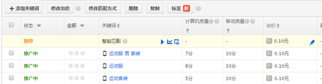 3、培養到10分之后我們就可以把這3個長尾詞刪除了。然后我們可以加我們需要推廣的大詞進去。建議大家不要一下子就加最大的詞可以先加:運動套裝男春秋、運動套裝男開衫等3級詞然后再加 運動套裝男。然后就是運動套裝、運動服等大詞進去!