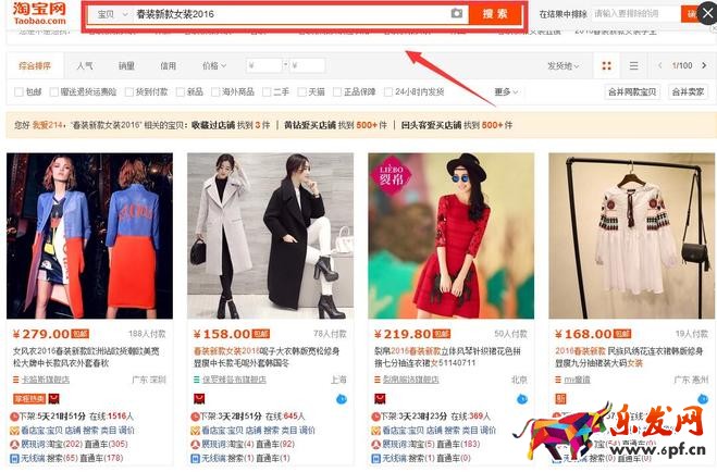 1、大家打開淘寶首頁,搜索關鍵詞。現在是春裝上新的季節,我以春裝舉例,搜索春裝。然后找到一個寶貝,搜索全標題,會出現如下結果: