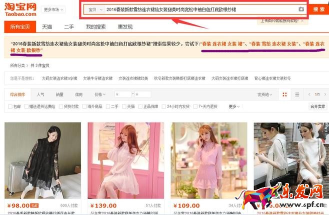 上圖劃線部分顯示:“2016春裝新款雪紡連衣裙仙女裝甜美時尚寬松中袖白色打底歐根紗裙”搜索結果較少,嘗試下:“春裝 連衣裙 女裝 裙”、“春裝雪紡 連衣裙 女裝”、“春裝 連衣裙 女裝 歐根紗”
