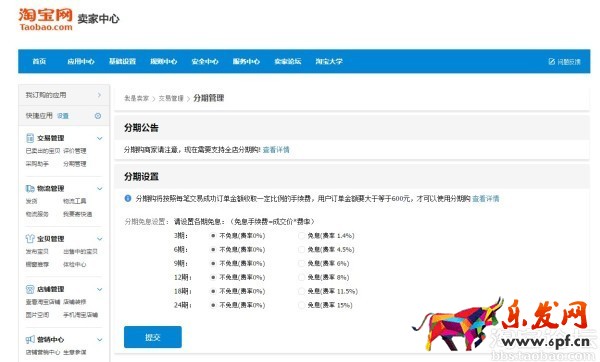 設(shè)置方法:1)首先需要訂購花唄的商家才可使用,否則設(shè)置界面無法使用;2)賣家需要打開新版賣家中心,如下圖顯示,點(diǎn)擊應(yīng)用中心,選擇交易管理,選擇分期管理應(yīng)用