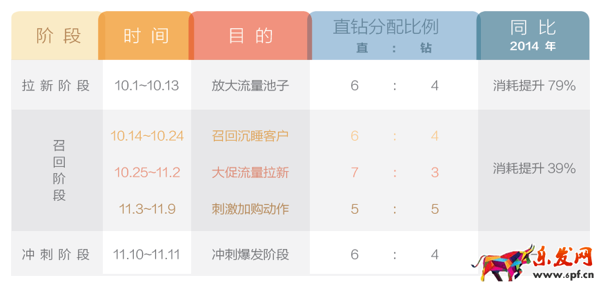 2015 年雙11 前夕,ZK 制定了253 投放策略,即將10 月1 日至11 月11 日這個時間段分成了拉新、召回、沖刺爆發(fā)三大階段,對應三大階段的營銷投入分別占比20%、50% 和30%,淘寶/天貓直通車與鉆石展位比例控制在6:4。當然投放策略并不是一個靜態(tài)的計劃, 具體到執(zhí)行方面,每個階段的直鉆比例會根據(jù)實際情況進行一些微調(diào)。