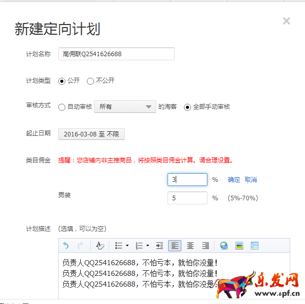 因為現(xiàn)在很多淘客安裝了淘客助手這個軟件。很多淘寶想推你產(chǎn)品的時候回很明顯的看到你的聯(lián)系方式,這樣就可以聯(lián)系你,到時候你們可以商量。那么如果覺得不是很明顯,也可以多建立幾個空白的計劃,留上聯(lián)系方式!在做淘客活動的時候,把計劃設(shè)置成公開計劃,手動審核。這樣被淘客擴散的時候,那些看到計劃的淘客,申請計劃就能看到你的聯(lián)系方式,有幾率加你的QQ。