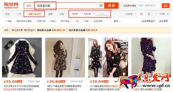 不同的目標(biāo)人群,不同的商品,消費(fèi)者關(guān)注的焦點(diǎn)就不一樣。根據(jù)上面的分析結(jié)果,碎花連衣裙,價(jià)格定位在35——140之間,我們看一下,打開淘寶,搜索框里面輸入“碎花連衣裙”,價(jià)格卡在35——140之間,然后按照銷量排行,找銷量最好的: