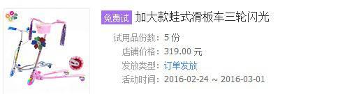 如:2.19報名三輪蛙式滑板車,考慮到剛剛過完年,對市場預估不準確,選擇庫存100個,計劃當日銷完?;顒觾r89元。