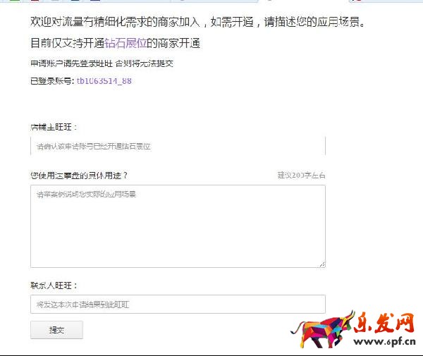 2.按要求依次填寫店鋪主旺旺,您使用達(dá)摩盤的具體用途,以及聯(lián)系人旺旺等。