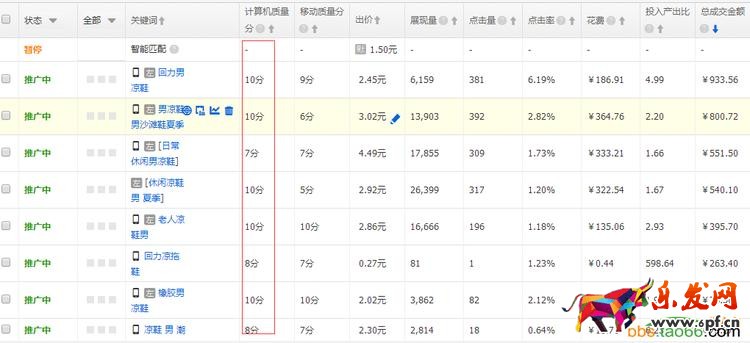 影響關鍵詞的質量得分的因素有: 1.)提高關鍵詞與寶貝標題屬性的匹配相關度。2.)提高關鍵詞與寶貝詳情頁之間的匹配相關度。3.)提高寶貝的點擊率4.)提高關鍵詞的流量,收藏,轉化。5.)提高關鍵詞的競爭度。