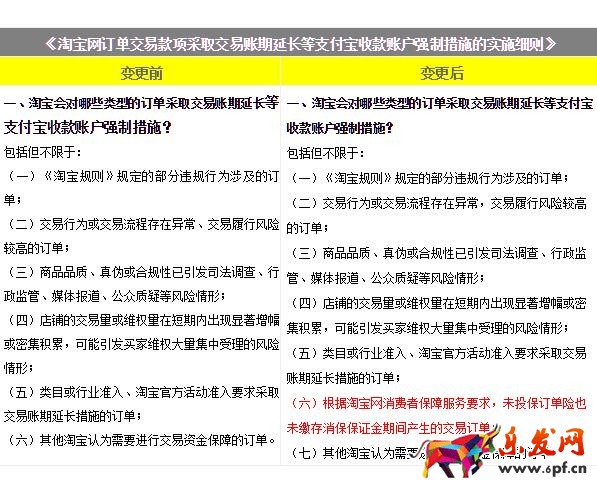 3、《淘寶網(wǎng)訂單交易款項(xiàng)采取交易賬期延長(zhǎng)等支付寶收款賬戶強(qiáng)制措施的實(shí)施細(xì)則》中,新增適用賬期保障的情形“根據(jù)淘寶網(wǎng)消費(fèi)者保障服務(wù)要求,未投保訂單險(xiǎn)也未繳存消保保證金期間產(chǎn)生的交易訂單” 。