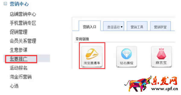 1.先新建一個推廣計劃:進入【淘寶賣家中心】→【營銷中心】→【我要推廣】,然后我們就會在“營銷入口”看到三個常用鏈接,分別是淘寶直通車、磚石展位和麻吉寶。點擊“淘寶直通車”。