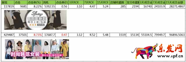 一家C店,主營韓版低價女裝,客單價在45元左右,目前店鋪等級為三金冠,主要運營思路是每天上新。鉆石展位每天消耗1000-2000元不等,點擊單價0.55元,3天點擊回報率是2.61,因店鋪特性,所以收藏量比較多,成交周期會比較長?,F投放遇到瓶頸,點擊單價已經是低于行業值,ROI高于行業均值,不知如何突破。在定向已經精準的情況下,鉆石展位專員另找思路,突破這一瓶頸,那么專員是如何操作的呢?天貓代運營小編先給大家看下鉆石展位專員優化前后數據,如下圖: