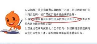 3.頁面中顯示有店鋪推廣的考試鏈接,請先詳細閱讀教程后參加考試,80分為通過,考試通過后7個工作日內(nèi)審核,審核結(jié)果以旺旺消息與直通車公告給予通知: