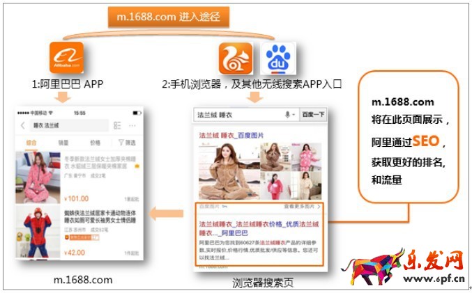 3、因為可以通過無線SEO,從手機瀏覽器或者其他搜索引擎app,搜索關鍵詞進入到m.1688.com,非快消在無線端同樣有流量 !