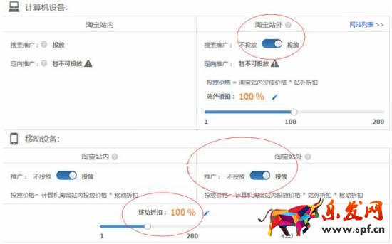 針對上面的情況,我們第一步先把PC和無線的站外平臺關閉,如果定向推廣能開啟的店鋪也建議先關閉,一般來說,這三個投放平臺總體上相比站內的點擊率會比較低,如果開啟會整體拉低整個計劃的點擊率。由于現在的無線端點擊率要比PC端的要總體高出不少,所以無線折扣方面暫時拉升到150%,如下圖。