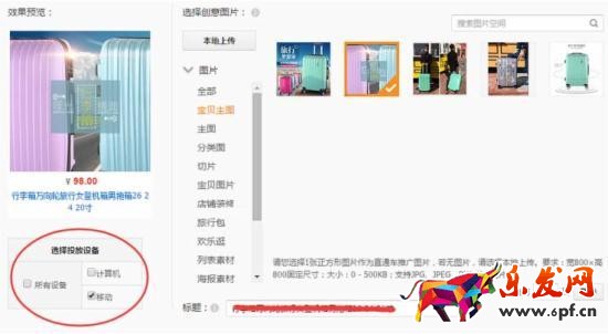 針對展現量更多偏向于PC端,而PC端對應點擊率偏低的問題上,我們一方面提高了無線投放折扣之外,我們可以讓PC端展現比較多的創意圖片只投放到無線端(如下圖),近兩天再觀察對應創意的展現和點擊率情況,如果點擊率還跟不上,操作方面主要就是更換創意圖片了。
