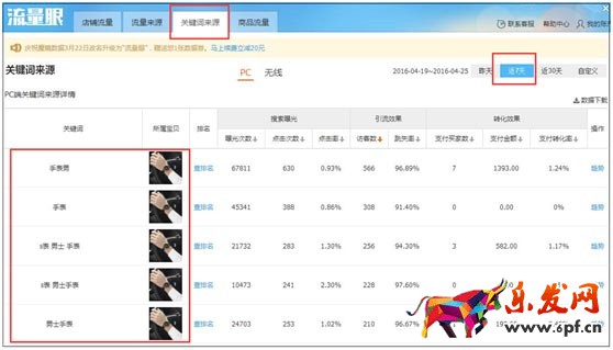 其實在某種意義上,你可以只關(guān)注無線端就可以了,當(dāng)然對于一些單價比較高的高端商品來講,PC端的數(shù)據(jù)還是值得關(guān)注的。在你新品上架的第一個周期結(jié)束的時候,你就看一下這個新品的關(guān)鍵詞流量來源,他會告訴你哪些詞帶來了最多的曝光,哪些詞帶來了最多的點擊,哪些詞你有很好的支付轉(zhuǎn)化率,哪些詞你的支付轉(zhuǎn)化率不行。比如第三張圖,看PC端的數(shù)據(jù),我們發(fā)現(xiàn),雖然“手表”這個關(guān)鍵詞帶來了不錯的展現(xiàn),但是轉(zhuǎn)化率很低。