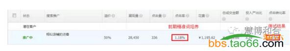 直通車潛在客戶最終溢價:50%左右,溢價降低,點擊率穩定,展現量提高,點擊量提高,并且轉化效果穩定。