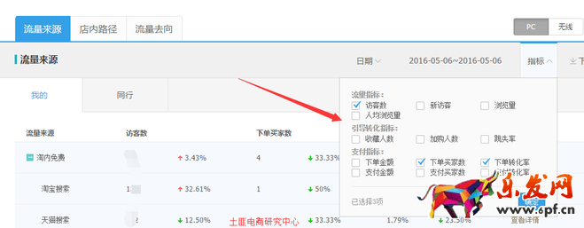 另外是大家要利用好這個功能,這個是我們土匪電商研究中心常用的,因為功能實在非常強大。因為他分日期,我可以把每天的數(shù)據(jù)記錄,之后對比,另外指標可以選擇,里面我們可以選擇訪客數(shù)、新訪客、瀏覽量、人均瀏覽量、收藏人數(shù)、加購人數(shù)、跳失率、下單金額、下單買家數(shù)、下單轉(zhuǎn)化率、支付金額、支付買家數(shù)、支付轉(zhuǎn)化率。
