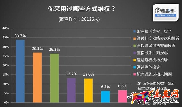 注:在同企鵝智酷2015年做的同期315調查數據對比,網民面對假貨選擇“隱忍”的比例降幅明顯(從2015年的五成降低為2016年的三成)。反映了網民在投訴意識和投訴行為上,有了明顯提升。