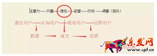 2、這三個(gè)階段消費(fèi)者總共經(jīng)歷6個(gè)點(diǎn):注意力——興趣——信任——欲望——行動(dòng)——滿意