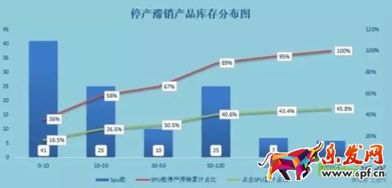 上面這張圖,我們發(fā)現(xiàn)了現(xiàn)在的庫存0-10個以下庫存的SPU占了總的停產(chǎn)滯銷款的36%,30個庫存以內(nèi)的占了58%,如果一個款庫存量大,我們可以通過活動清理或者花精力推,但是對于那些就幾個十幾個庫存的,是非常難清理的,又占據(jù)了店鋪過長SPU,影響動效率,花精力推又沒有貨,因此也可以嘗試找下線下渠道,尾貨清理等,總比壓著資金占著庫存和損耗,而大部分運營都是業(yè)績?yōu)橹鳎芏鄷r候會忽略這些庫存問題,拼命開發(fā)要貨。