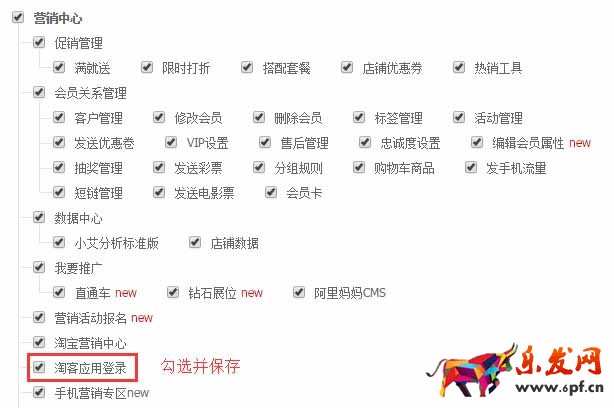 3、點(diǎn)擊補(bǔ)充權(quán)限,選擇”官方功能“,勾選”淘客應(yīng)用登陸“并保存即可!