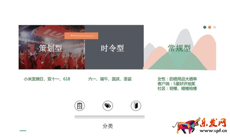活動的分類大致可以分為以上三類,當然從其他維度還可以分為:征集類、交流類、投票類、抽獎類、游戲類等等,但是殊途同歸,都可以往大的分類上去對應,這些就不多余的講了。活動的分類可以在年度活動方案中根據產品的實際情況來去規劃布局即可。