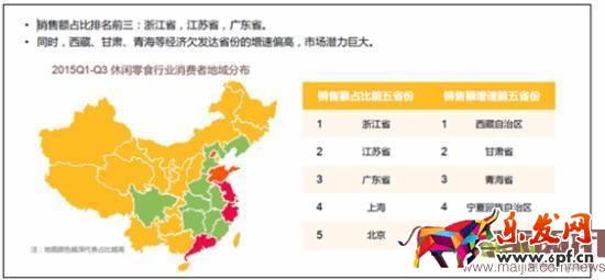 CBNdata《報告》顯示,零食銷售排名前三的是:浙江省、江蘇省、廣東省,整個二線城市以接近50%的分布占據了休閑零食消費的主力軍。但是,同時,西藏、甘肅、青海等經濟欠發達的地區,增速非常快,市場潛力巨大。同時,還有一個更為重要的特點:中西部等經濟欠發達的地區,移動端消費的比重更高。