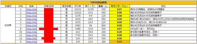 優(yōu)化之前,我先把【無花果】類目行業(yè)排名前10的產(chǎn)品做了一個簡單的調(diào)研分析: