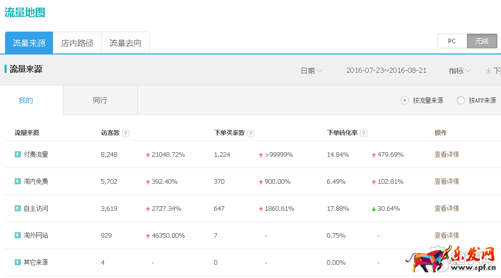 8月3號無線端訪客數38,下單買家1人,支付轉化率2.63%。8月22號無線端訪客是有達到405人。