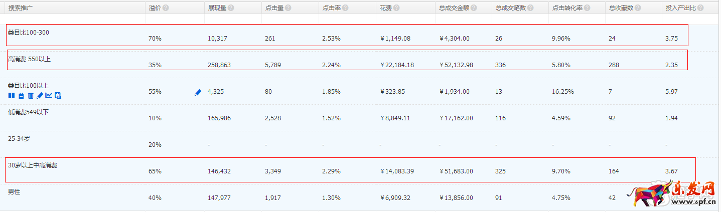 搜索人群注重中高消費30歲以上人群,類目比100以上,細分人群數據可看到類目比100-300投產比達3.75,月均消費額度月550元+投產比2.35,這一部分人群的流量也非常大,30歲以上中高消費投產比3.67。進一步提升了流量與投產比,效果非常明顯。